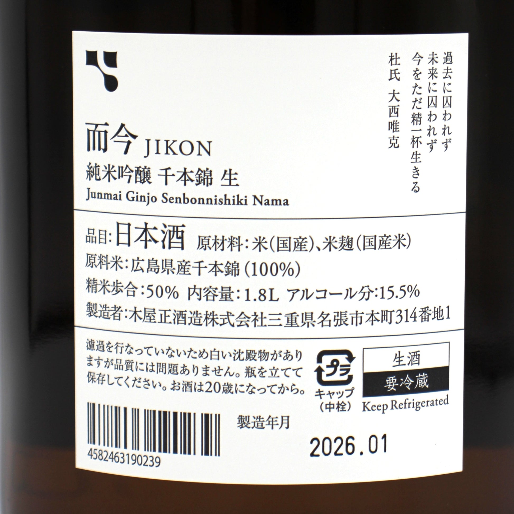 木屋正酒造 而今 じこん 純米吟醸 千本錦 生 2025 日本酒 生酒 15.5% 1800ml 箱無し(2026年1月製造)